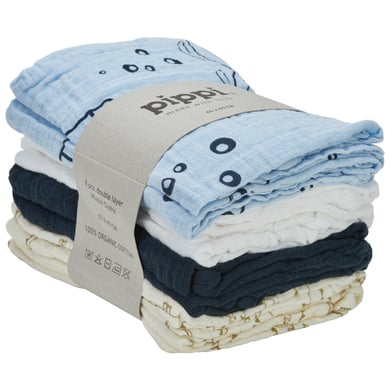 Pippis muslintepper er et must for foreldre. Pakken med 8 er perfekt til daglig bruk og kan brukes som et lite teppe, smokk, tøybleie eller over skulderen for å beskytte klærne etter barnet ditt. Laget av 100% bomull som føles godt mot huden, du kan bruke disse til alt!